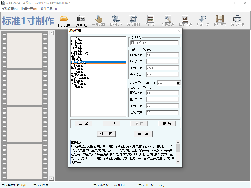A.支持各种证件照规格:系统内置了17种常用的证件照规格,还可以设置自己所需要的证照规格