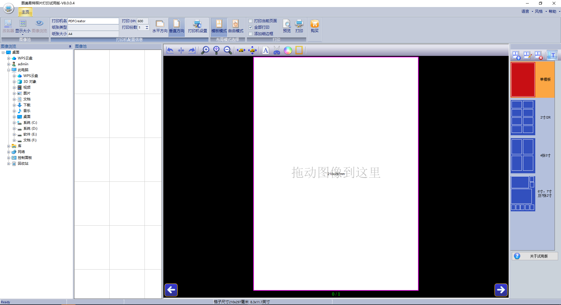 一、模板方式除了提供了大量的打印模板,用户还可以根据纸张大小自定义模板。自由手动方式可以直接拖动图像到布局页面上调整位置,尺寸。