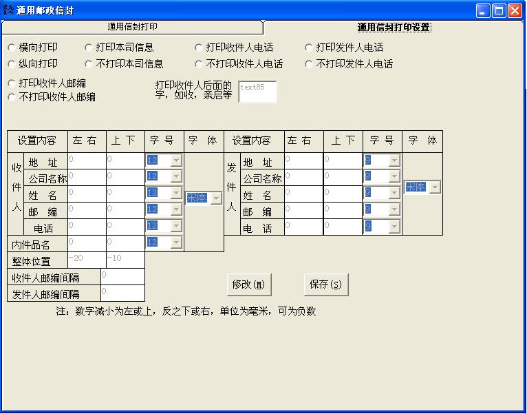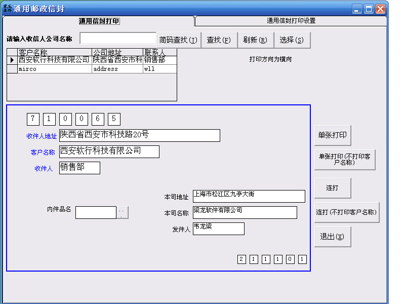 提供信封设计功能,用户可以按照自己的需要修改模板,支持多种信封规格,支持横向打印和纵向打印设置,支持多种打印字体选择,兼容所有型号的打印机,超长单位或地址可设定自动换行打印;自动保存打印记录并可调出重新打印。