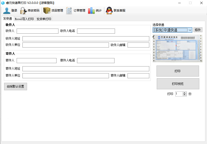 支持在程序中一键填入收件人和寄件人的信息,并可一键打印,支持的快递单包括中通快递、圆通快递、韵达快递、申通快递、顺非快递、EMS等目前最大的快递公司的快递单打印,且同时支持Excel导入打印及发货单打印。