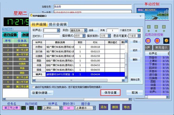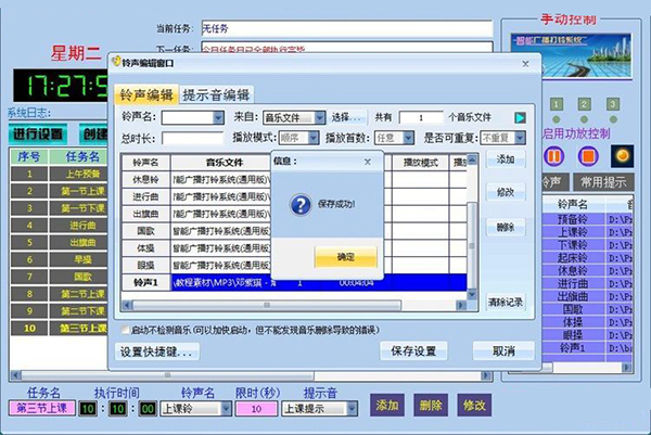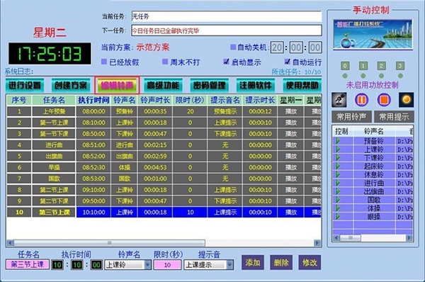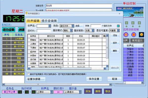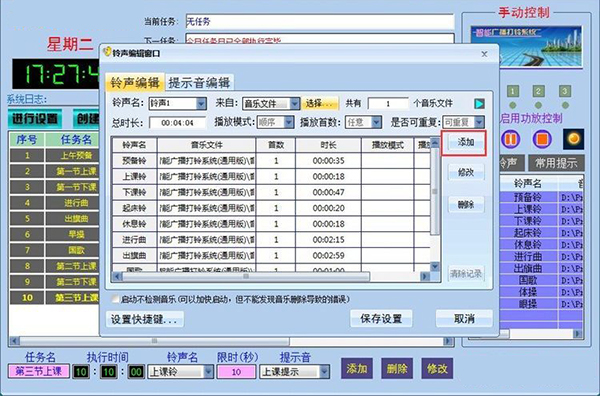 3、可以添加任意多个铃声广播任务,完全可以满足各类学校和公司、工厂的作息铃声广播程序需要。