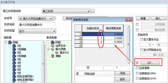 如图,表示设置了三个阶段,0表示当前施工阶段,1和2分别表示接下来的两个施工阶段,这样的设置表示当前施工阶段产生的应力需要在经过这三个阶段才能释放完。每个阶段应力释放比例则分别为40%。30%,30%。注意如果当前阶段设置了LDF,承受应力释放的后续阶段(这个例子中是下两个阶段)不需要再设置(解释说明详见相关知识)。另外无论设置几个阶段,LDF中指定的应力释放系数之和必须为1。