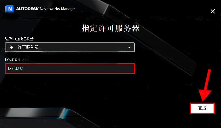 9、输入服务器名称【127.0.0.1】,点击【完成】