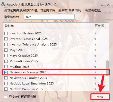 6、勾选【Navisworks Manage2025】,点击【安装】