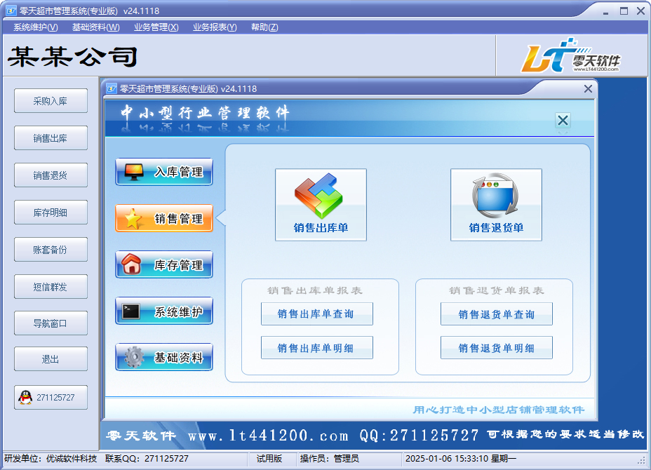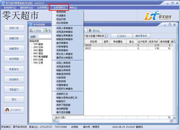 零天超市管理系统是一款非常优秀的超市销售系统软件,该软件拥有入库管理、销售管理、库存管理、系统维护、采购入库、销售出库、库存明细、短信群发等众多的实用管理功能,操作简单、界面美观大气是它最大的特点,用了它以后超市管理者就能更好的将超市管理的更好,从而提升超市的整体营收业绩。
