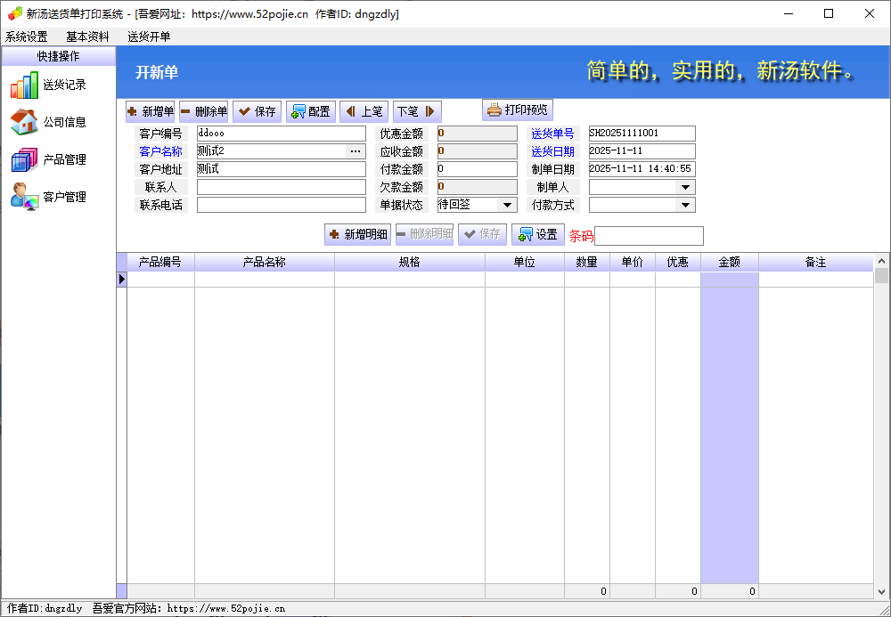 新汤送货单打印系统(吾爱专版)是由吾爱网友免费分享的一款小巧实用,完全免费的通用送货单打印管理工具。可为用户提供完整的送货单打印、管理服务,通过本软件,您可以自由建立基本资料,客户信息,产品资料等,同时支持欠款管理,支持客户欠款,过段时间还款操作,可以直接开单,保存打印,有记录查询,同时,软件还有扩展字段,可自定义需要的项目,功能算是比较全面的了,基本可满足普通商户需求。本软件完全免费,安全无毒,去除了登陆用户和密码,直接在提示框里面,点登陆,就可以进入,有需求的用户请下载体验。