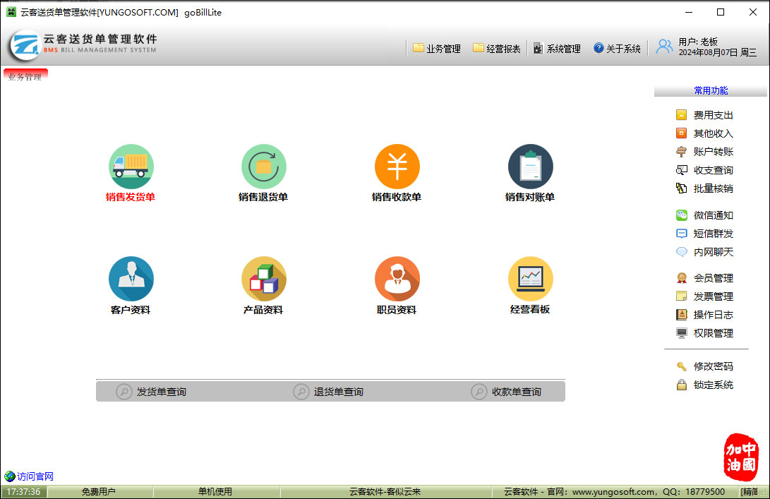 此外,云客送货单管理系统还兼具了收支查询、会员积分/等级管理、发票管理、附件管理、微信通知、短信群发、内网聊天等等丰富功能,可以更好的协助您有效来提高工作效率,欢迎有需要的用户们免费下载体验。