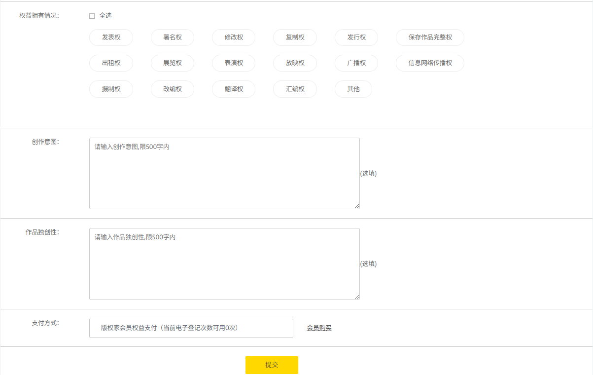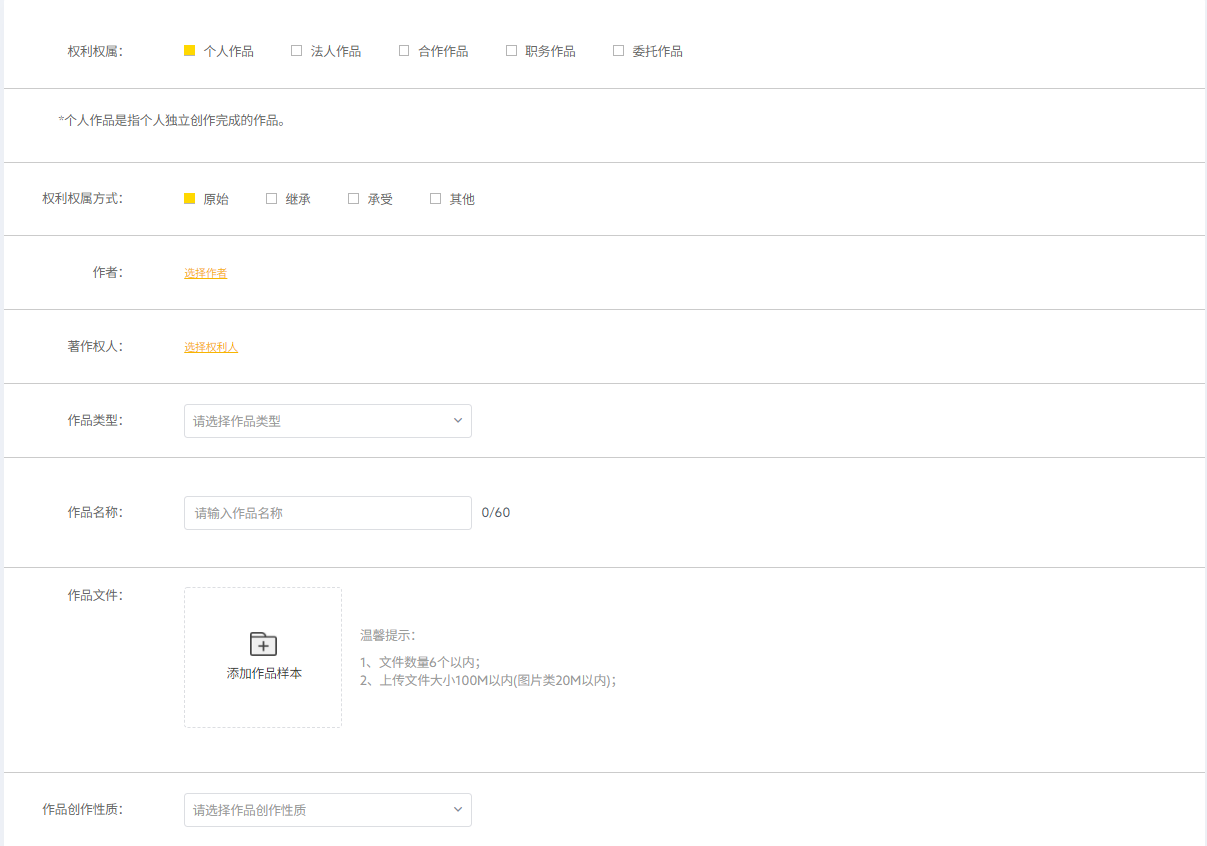 1、个人用户实名认证后可以申请本人的个人作品版权登记,也可以申请个人与其他作者/著作权人的合作作品;