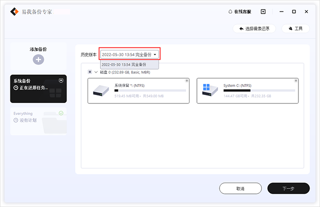 2、选择一个历史版本的备份图像,确认内容后,点击下一步按钮。