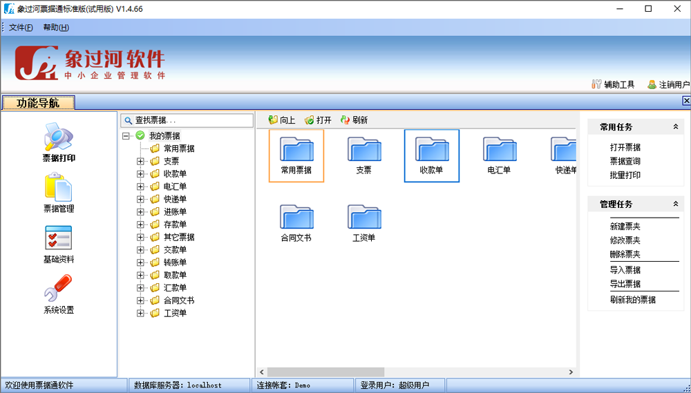 象过河票据通是由象过河软件专门针对各企事业单位开发的一款专业级票据打印工具软件,主要包括票据精确打印、票据套打、票据批量打印、票据模板设计、智能化录入、票据查询、票据流程化管理、票据基础资料管理等功能。支持各个快递物流公司的快递单打印,也支持银行和其他票据的打印,操作简单,使用方便,有兴趣的朋友请下载使用。