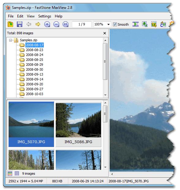 三、在 MaxView 中打开存档文件时,其文件夹结构和缩略图列表将显示在窗口的左侧。您可以通过缩放,滚动甚至播放带有您喜欢的音乐的全屏幻灯片来查看照片。完成后,只需关闭MaxView,它就不会为其他人留下任何东西。