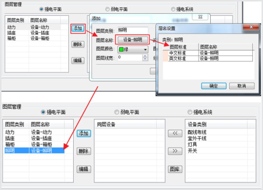 1.添加一个需要的图层类别:点击“添加”,输入“图层类别”为“照明”,可以设置图层名称,依次点击确定后,就会在左侧空白处增加“设备照明”层。见下图
