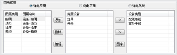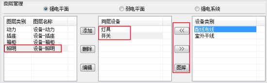 设备图层管理也可以分为强电平面、弱电平面、强电系统三个功能模块,界面分为三个区域,如下图所示,左侧为自定义图层类别,中间为需要设置为同层的设备,右侧为设备类别。