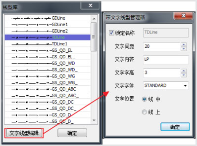 [带文字线型编辑]点击该按钮,弹出下左图所示线型库界面,展示所有带文字线型;双击线型或者点击“文字线型编辑”按钮,可以对当前线型进行编辑,弹出下右图所示线型管理器界面,设置当前所选线型的文字参数,确定后线型数据保存并更新。