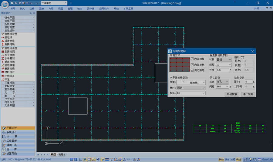 接地线线型自由选择,可随意绘制主接地网,也可根据建筑物外轮廓自动生成接地网。