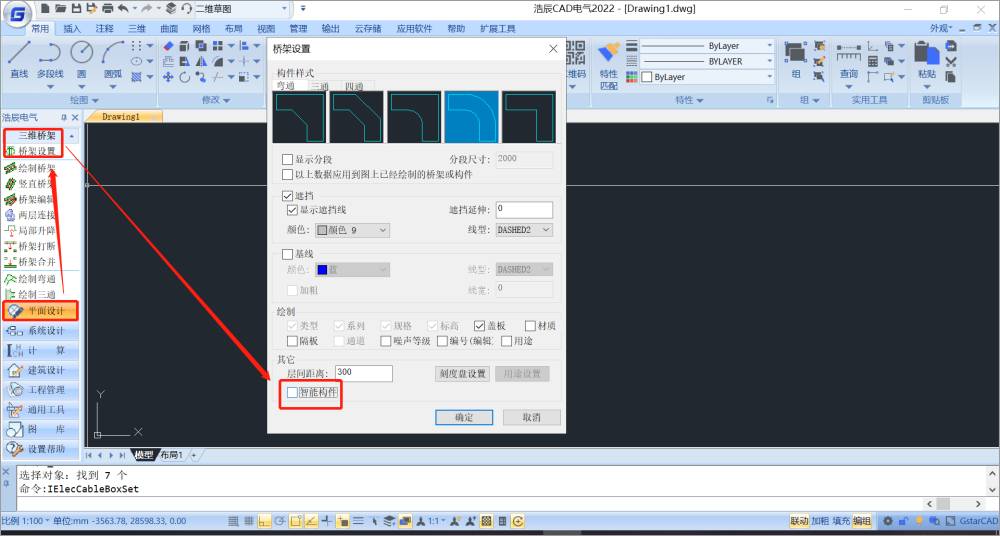 依次单击电气工具箱中的【平面设计】、【三维桥架】、【桥架设置】,找到【智能构件】,取消勾选即可