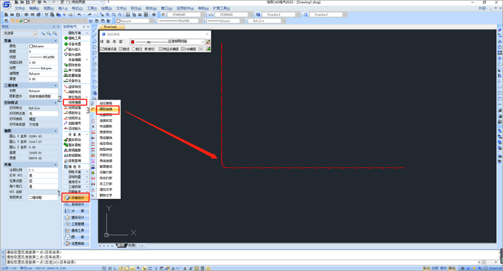 浩辰CAD电气软件中线缆已经全部采用实体对象线缆,使用FILLET对实体对象不起作用,所以我们可以选择“圆弧连接”功能进行操作。点击浩辰CAD电气软件左侧工具箱-平面设计-强电平面-线缆编辑-圆弧连接功能即可。