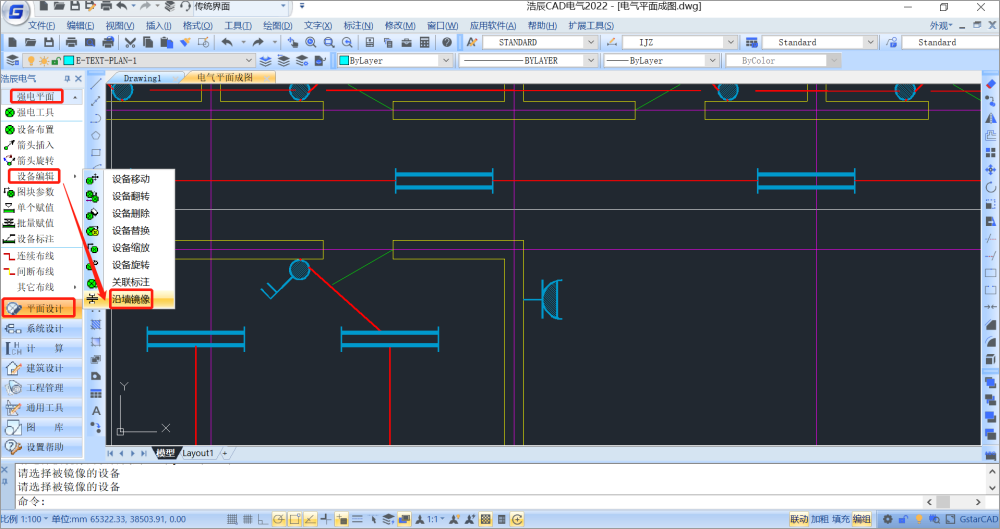 可以在电气工具箱中找到【平面设计】--【强电平面】--【设备编辑】中的【沿墙镜像】功能(YQJX),镜像设备