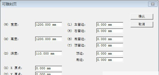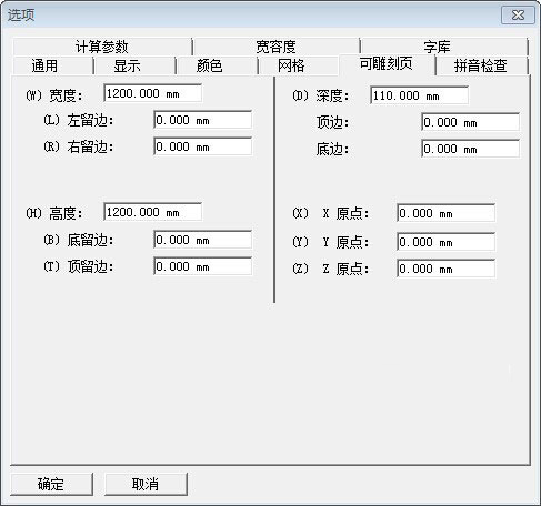 (2):“可雕刻页”中,分别把其中的宽度、高度、深度改为机器幅面的大小,如RS1212型,宽度为1200mm,高度为1200mm,深度为110mm,其余均为0,单位为毫米:mm。确定。