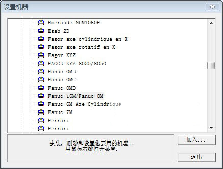 1:在桌面或程序中打开Type3,在打开的“设置机器”中,点击“加入机器”前的“+”号,再展开“CNC机器”,找到“Fanuc 16M/Fanuc 0M”并选择,点击“加入”,如下图所示: