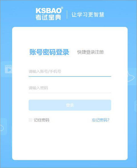2、点击右上角的按钮“充值”,在弹出的登录框中输入账号登录,如第一次使用考试宝典,请点击“立即注册”注册账号。(题库开通后是绑定这个账号的,不绑定设备。)