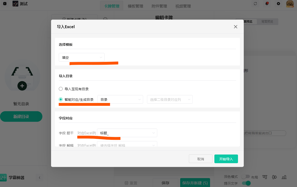 第三步:导入Excel表后,依次选择模板,目录,对应的字段选项。