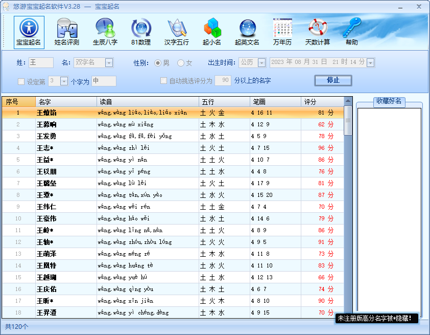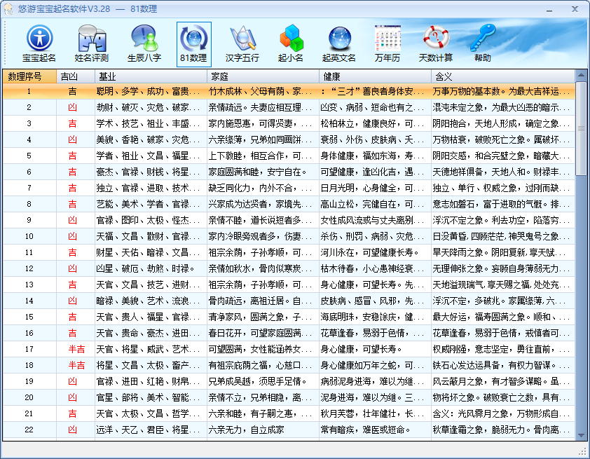 3、软件采用《五行平衡起名法》,并结合宝宝姓氏、性别、生辰八字、天格、地格、人格、外格、总格、三才数理、基础运、成功运、人际关系、五行元素、好听等多种因素为您取到称心如意的名字。
