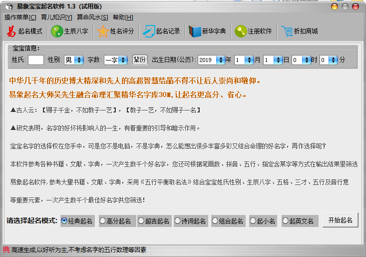 易象宝宝起名软件可以帮你取好名字。该起名软件的主要功能有【经典起名】【高分起名】【超吉起名】【诗词起名】【组合起名】【起小名】【起英文名】等模式生成名字,并且独有英文名字朗读功能。除起名功能外软件还有丰富的与取名相关功能,如【生辰八字】【姓名评分】【新华字典】【育儿知识】【起名知识】【风水知识】等。软件提供近3000篇起名知识文章,提供近6000篇育儿知识文章,拥有功能强大的新华字典功能。