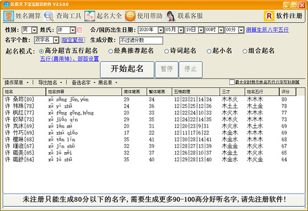 另外,名震天下宝宝起名软件还有高分超吉五行起名,经典推荐起名,诗词起名,起小名,组合起名这五种模式可供您选择。ps:名震天下宝宝起名软件不注册的话,每次只会显示10个名字,注册之后每次就可以生成数千个名字可供选择,各位有需要的小伙伴可以下载收藏使用。