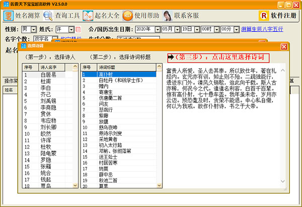 这个功能可以为小孩去一些有诗意的名字,输入性别,姓氏,出生年月日后,选择诗词起名,点击开始取名,这时候会跳出一个选择诗词界面,选择好对应的诗词,点击立即取名,就会出现一些富有诗意的名字。