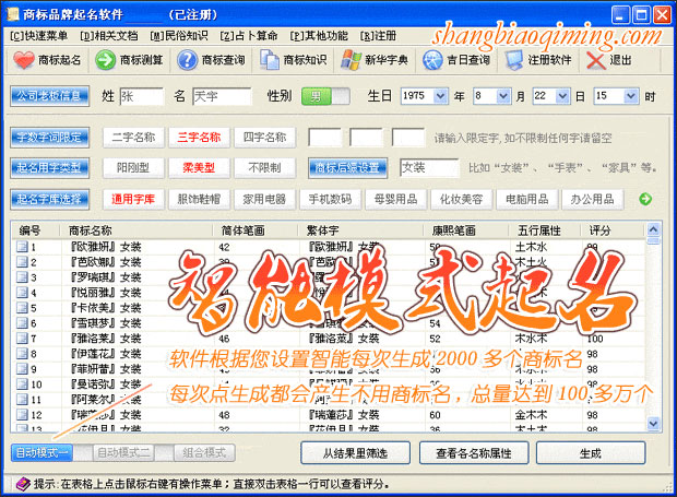 商标品牌起名软件可产生上百万个二字名、上千万个三字名、上亿个四字名,让您轻松选择满意的名字。