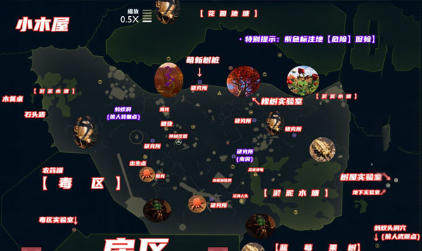 地图上标明了毒区、房区、蓝莓果树、橡树实验室、萌新树桩、出生点等处的具体位置。