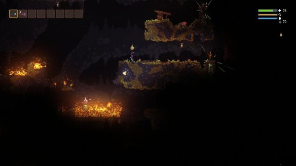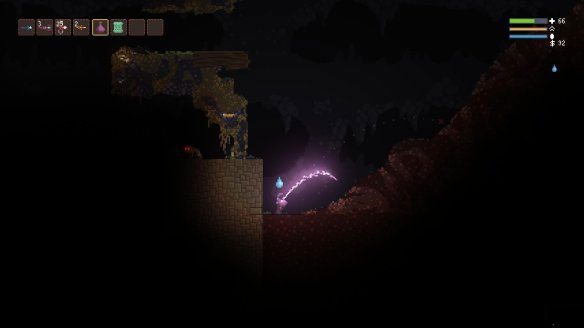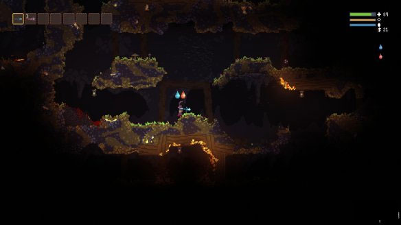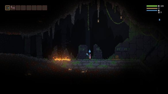 游戏中很多场景都可以破坏,某些道具还会产生连锁反应。例如最初洞穴里天上的吊灯在被玩家击落后就会在地上生成火焰,而火焰一但落在木头等可燃物上就会将其烧干净。这些危险的元素对于玩家和敌人来说同样都是有威胁的。如果身上着火或者染了毒液那么找一处水池浸泡就是当务之急。