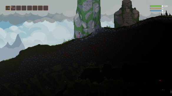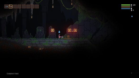 每局游戏开始前玩家都会出现在写着操作介绍的石碑下,左右移动都比较平常但是上下键需要额外说明一下。玩家所操控的是一名类似巫师职业的角色所以是没有翻滚跳跃这种野蛮动作的,取而代之的是其独特的浮空术。当玩家按住W/Space时角色就会飞起来并消耗右上角的浮空条,在空中可以进行左右移动和攻击指令。
