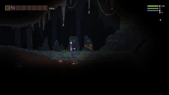 地下世界的入口就在右边,当然左边也是可以探索的我们一会再谈。在洞穴中会提示玩家使用快捷键切换武器打开背包等等。F键可以踢开部分物体(包括炸药箱)并且不会将其损坏。