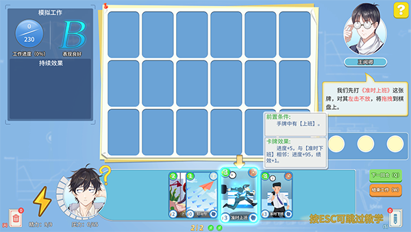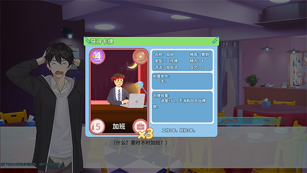 玩家可以通过主线剧情、日常事件抉择、完成工作等一系列方式,获取拥有不同能力的卡牌。在工作开始前,你可以自由地构筑合适的牌组,用最高效率的方式来完成游戏中的每一场工作。