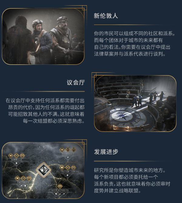 你的市民希望能在城市的管理运营方面参与意见。每个派系都有自己的意识形态和对未来的想法,但也有一个共同点——对权力的无尽渴求。你必须在议会厅中谨慎选择盟友。