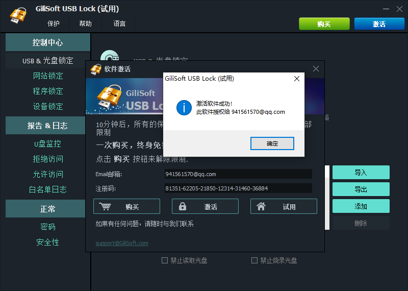 3、最后将获取到的激活码复制到软件中,邮箱号自行输入即可成功激活。