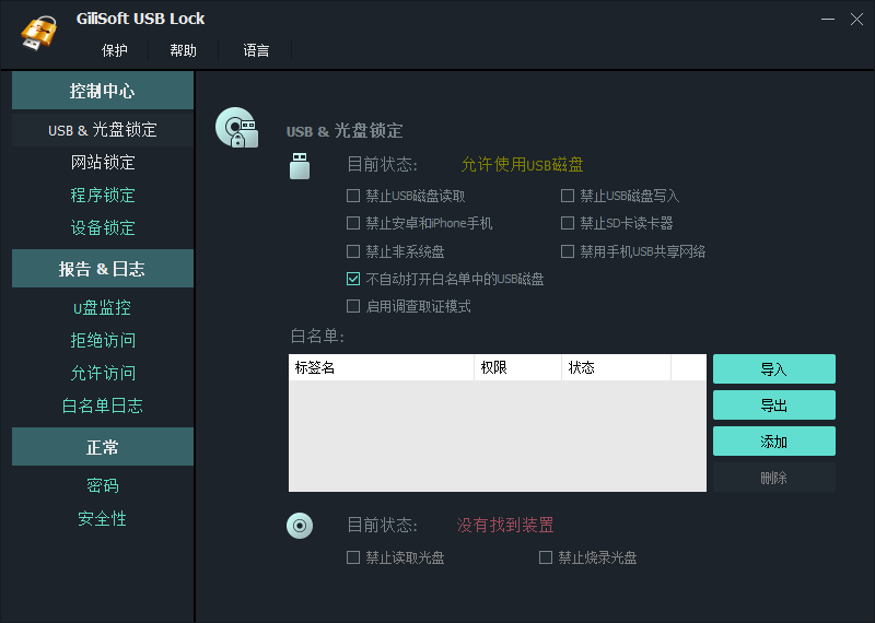 禁止从USB / SD磁盘读取,禁止写入USB / SD磁盘,阻止非系统分区。它不允许任何类型的USB / SD驱动器访问您的计算机,除非您对其进行了授权或它已在受信任的设备白名单中。
