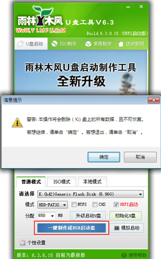 2、插入U盘之后点击一键制作启动U盘按钮,程序会提示是否继续,确认所选U盘无重要数据后开始制作: