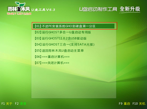 插入U盘启动后点击“不进PE安装系统GHO到硬盘第一分区”即可进入安装系统状态了: