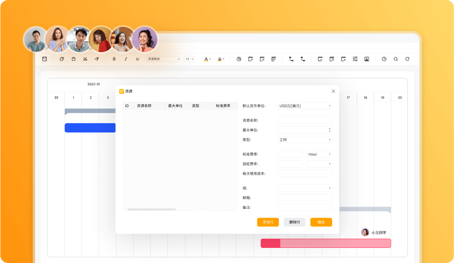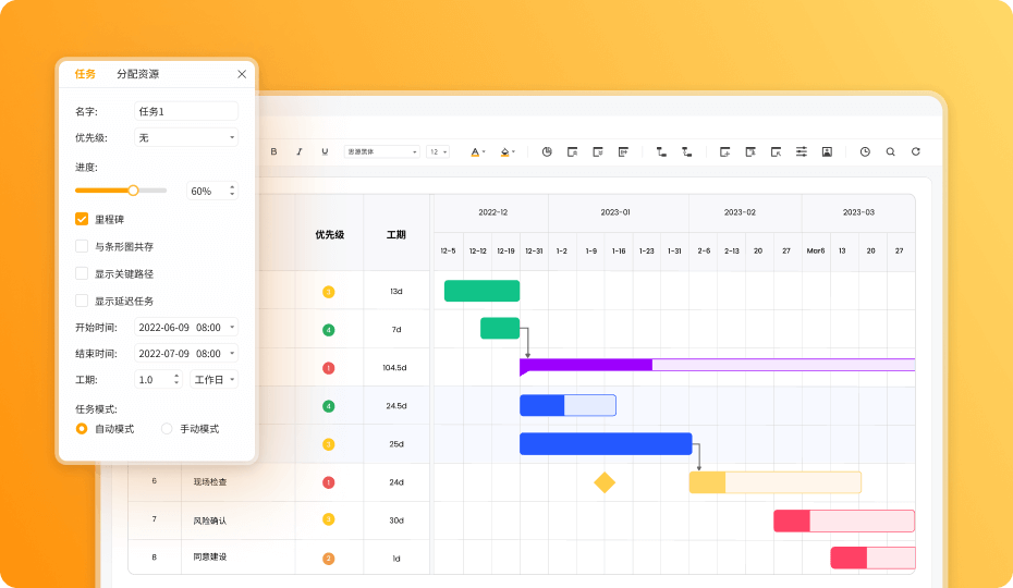 可轻松拖放项目进度条,便捷式添加、移除或升级任务。