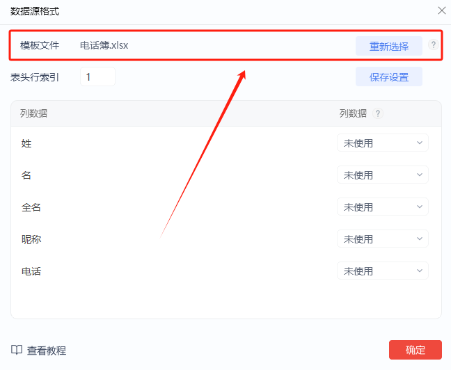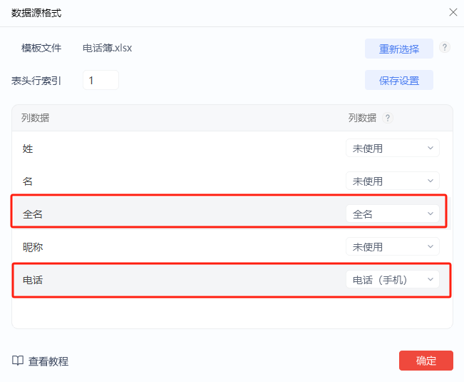 数据源格式(Excel转VCF):告诉软件表格每个列存储什么类型/格式的数据。