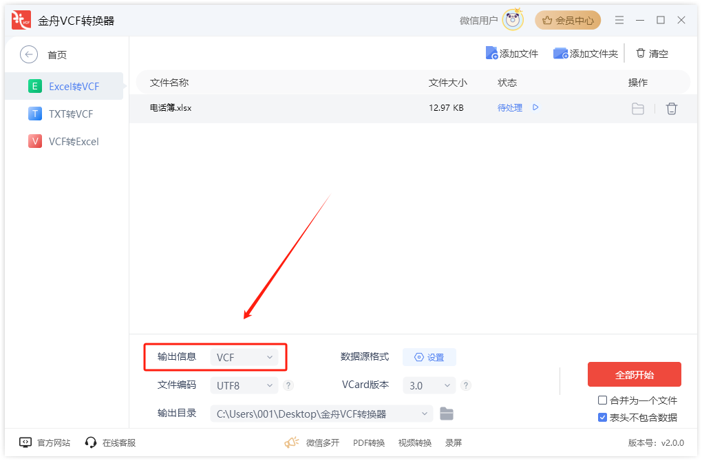 步骤1:金舟VCF转换器进行【Excel转VCF】,直接拖拽Excel表格添加,下方【输出信息】中设置导出格式【VCF】。
