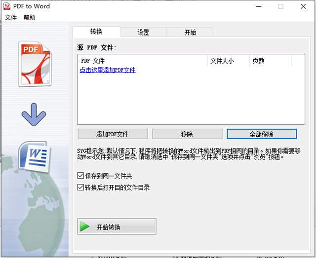 注意:默认情况下,程序将把转换的WORD文件输出到PDF相同的目录,如果你需要移动WORD文件到其他目录,请取消选择“保存到同一文件夹”选项并点击浏览“按钮”设置