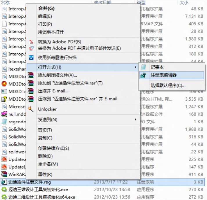 【注意】:如果没有弹出上面的注册提示窗口,说明您的系统打开注册表文件(.reg)的方式不是“注册表编辑器”,需要手工将文件【根目录\迈迪插件注册文件.reg】用注册表编辑器打开,才能在SolidWorks中注册插件(如下图所示)