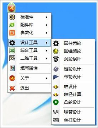 圆柱齿轮、圆锥齿轮、蜗轮蜗杆、滚子链、齿型链、V带、平带、同步带、多锲带、轴设计、凸轮工具、弹簧设计、丝杠。