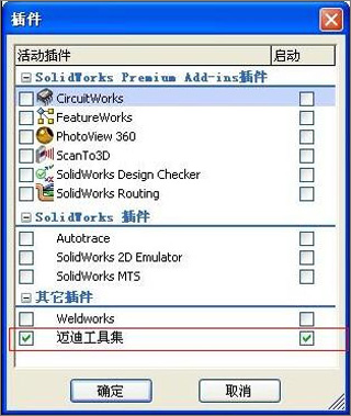 5、在SolidWorks中注册插件:选中后打开SolidWorks会存在迈迪插件。