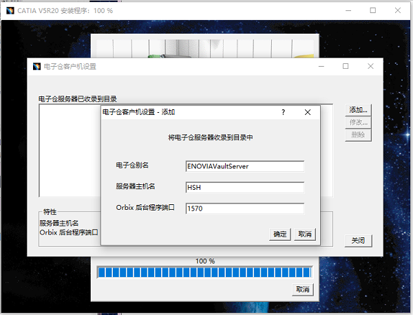15、当CATIA安装进度条达到100%时,自动弹出“电子仓客户机设置”窗口。