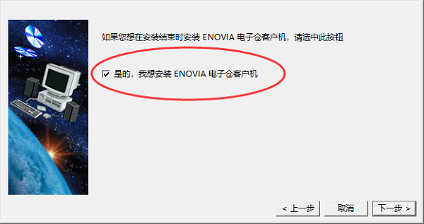 10、为保证软件的完整性,勾选“是的,我想安装 ENOVIA 电子仓库客户机”后点击下一步;